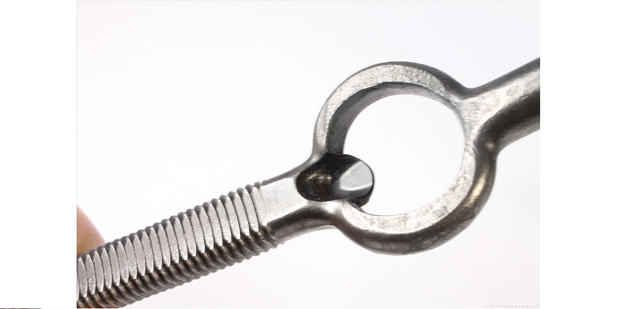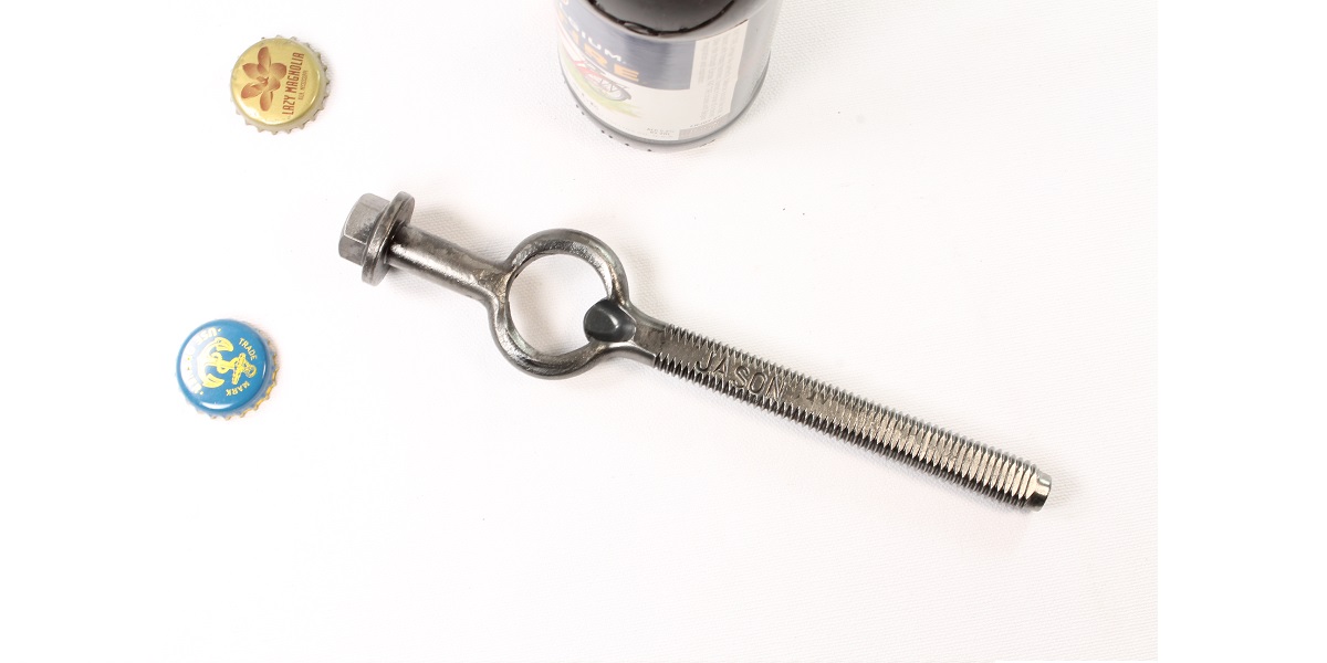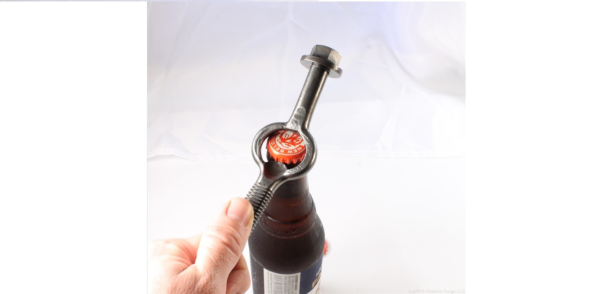 I hand forge each one of these bottle openers from a diesel truck engine bolt. I heat the piece to 2000 degrees F, then use a slot punch to make a long, thin hole in the bolt. Next I hammer a tapered round drift through the slot to make the opening circular. Finishing touches are then added, like punching the tab, flattening the handle, and hot-punching the personalization by hand.